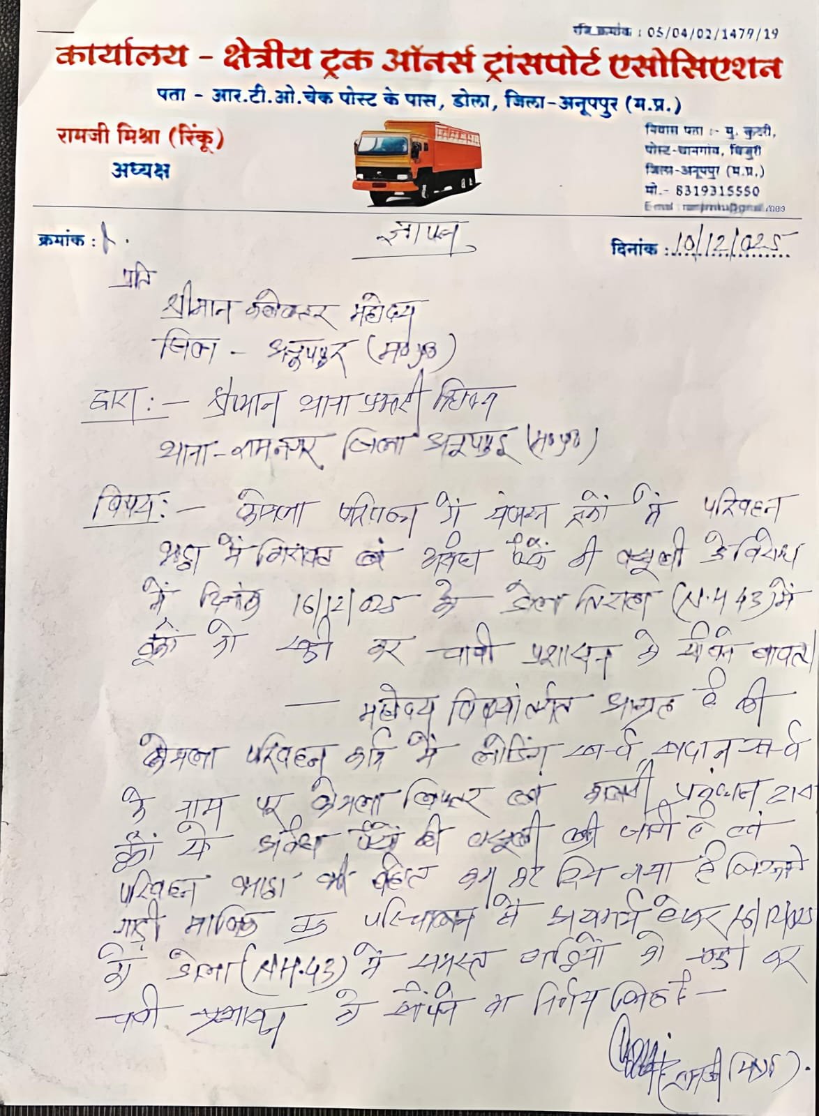 अनूपपुर।क्षेत्रीय ट्रक ओनर्स एसोसिएशन ने लंबे समय से गिरते भाड़े और ट्रांसपोर्टरों द्वारा की जा रही अवैध वसूली से परेशान होकर बड़ा कदम उठाने का निर्णय लिया है। इसी संदर्भ में एसोसिएशन ने माननीय कलेक्टर के नाम थाना प्रभारी रामनगर को एक विस्तृत ज्ञापन सौंपा है। जिसमें एसोसिएशन ने चेतावनी दी है कि 16 दिसंबर 2025 को डोला तिराहा, नेशनल हाईवे-43 पर सभी मोटर मालिक अपने ट्रक खड़े कर देंगे और उनकी चाभियाँ कलेक्टर महोदय को सौंपेंगे, ताकि प्रशासन को संकट की गंभीरता का एहसास हो सके।