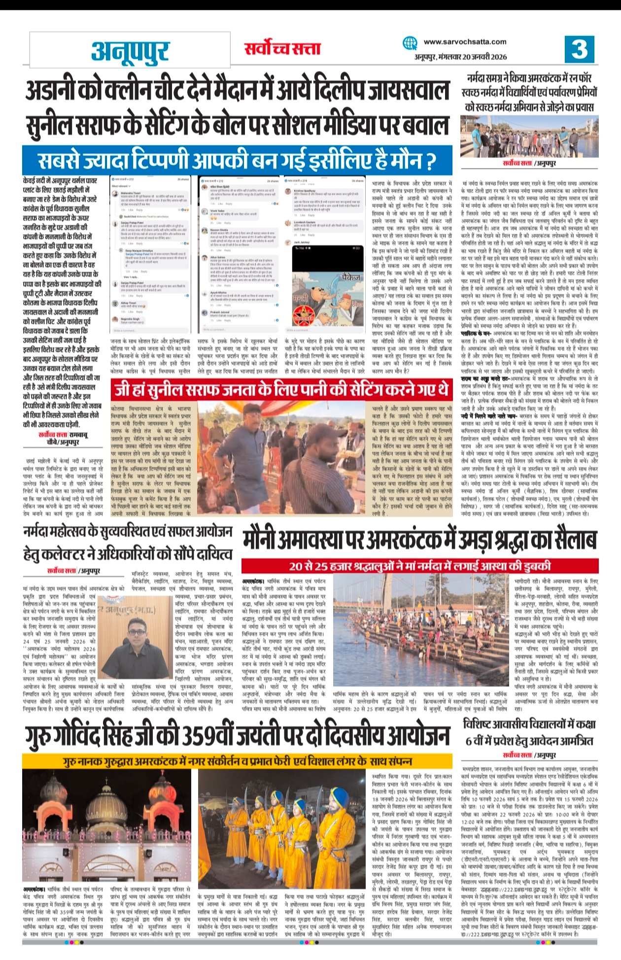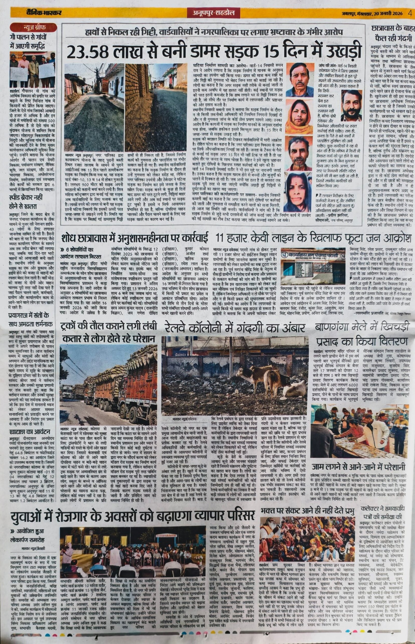 Uncategorized Today leed news papaer anuppur, अनूपपुर जिले के आज के सभी प्रमुख अखबारों के पन्ने ADMIN January 20, 2026 0 Continue Reading Previous उमरिया जिले के आज प्रमुख समाचार पत्रों के पन्ने, सिर्फ एक क्लिक पर…watchNext इंदिरा गांधी जनजातीय विश्वविद्यालय में बड़ा प्रशासनिक फेरबदल, 28 अधिकारी बदले गए More Stories Uncategorized रेत माफिया का कहर जारी, अवैध उत्खनन से भरे ट्रैक्टर के पलटने से मासूम युवक की मौत, हादसा या सिस्टम की हत्या Staff January 27, 2026 0 Uncategorized रानीझाप की पीड़ित महिला की लड़ाई में सामने आई मानवाधिकार एसोसिएशन एवं महिला कांग्रेस जांच दल गठित Staff January 27, 2026 0 Uncategorized गौरेला ब्लाक कांग्रेस कमेटी के तत्वावधान में संजय चौक में वरिष्ठ कांग्रेसी सुखदेव सिंह ग्रेवाल द्वारा ध्वजारोहण किया गया Staff January 27, 2026 0 Leave a Reply Cancel replyYour email address will not be published. Required fields are marked *Comment * Name * Email * Website Save my name, email, and website in this browser for the next time I comment. Δ